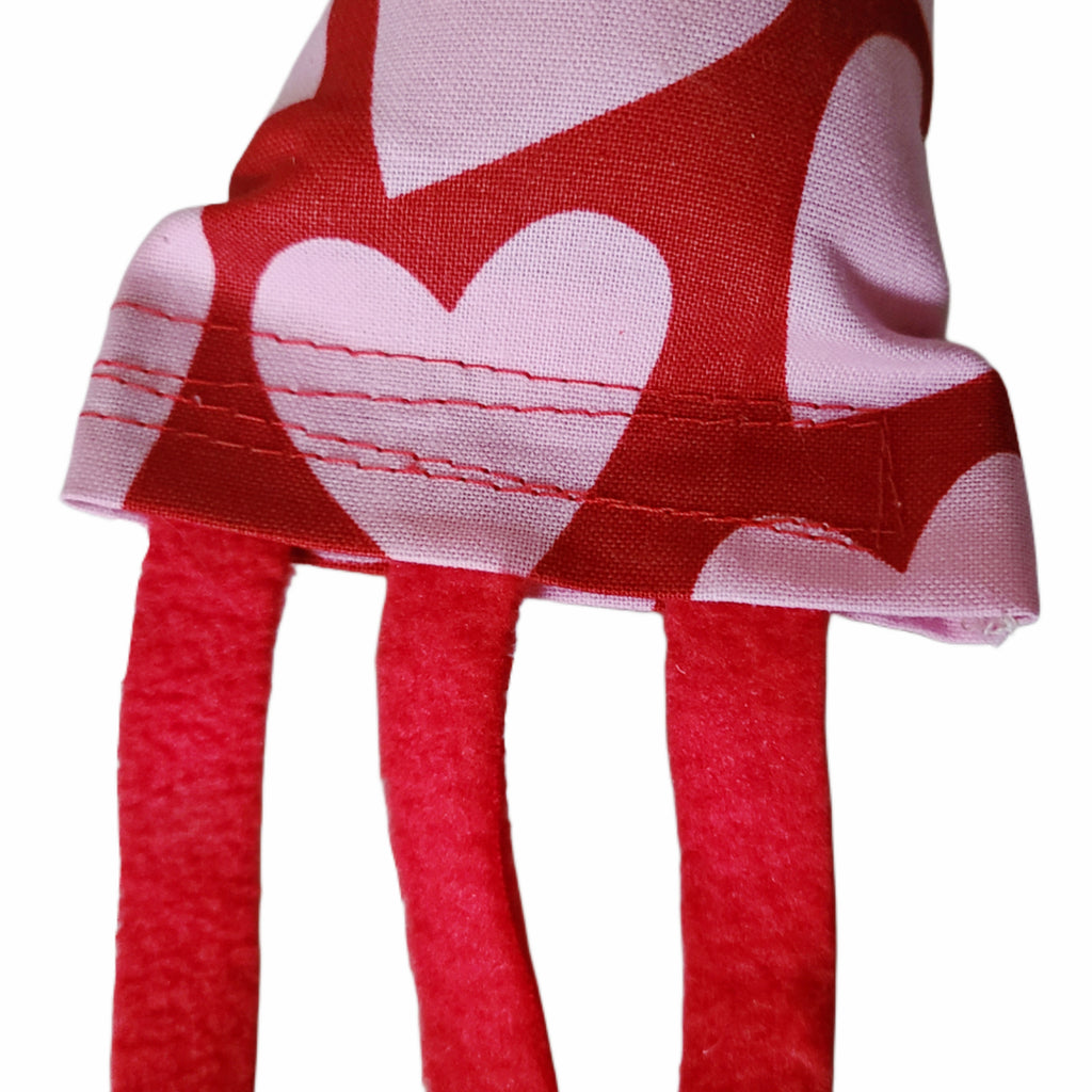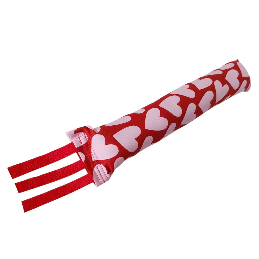 This handmade Kick Stick is made of printed cotton with a red background and pink hearts that your kitty will love! It's soft cotton and has red felt, claw-proof tassels that kitties can bat their paws at. Plus, it's stuffed with a generous portion of our popular herbs and blends to keep them interested. It is enclosed with velcro on one end and can be refilled with any of our herbs, so it can be refreshed and reused. Shake the Kick Stick tassels above your kitty's head or on the floor nearby and let them chase the kicker for a while before letting them grab, bite and kick it to get some energy out of their system.